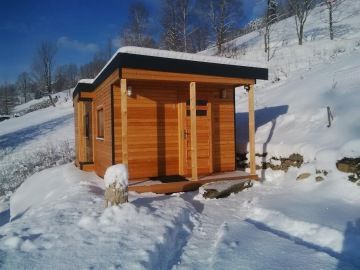Nabízíme možnost saunování ve venkovní dřevěné sauně se solnými kameny s kapacitou šest osob. Jako ochlazovací bazének je k dispozici venkovní káď.